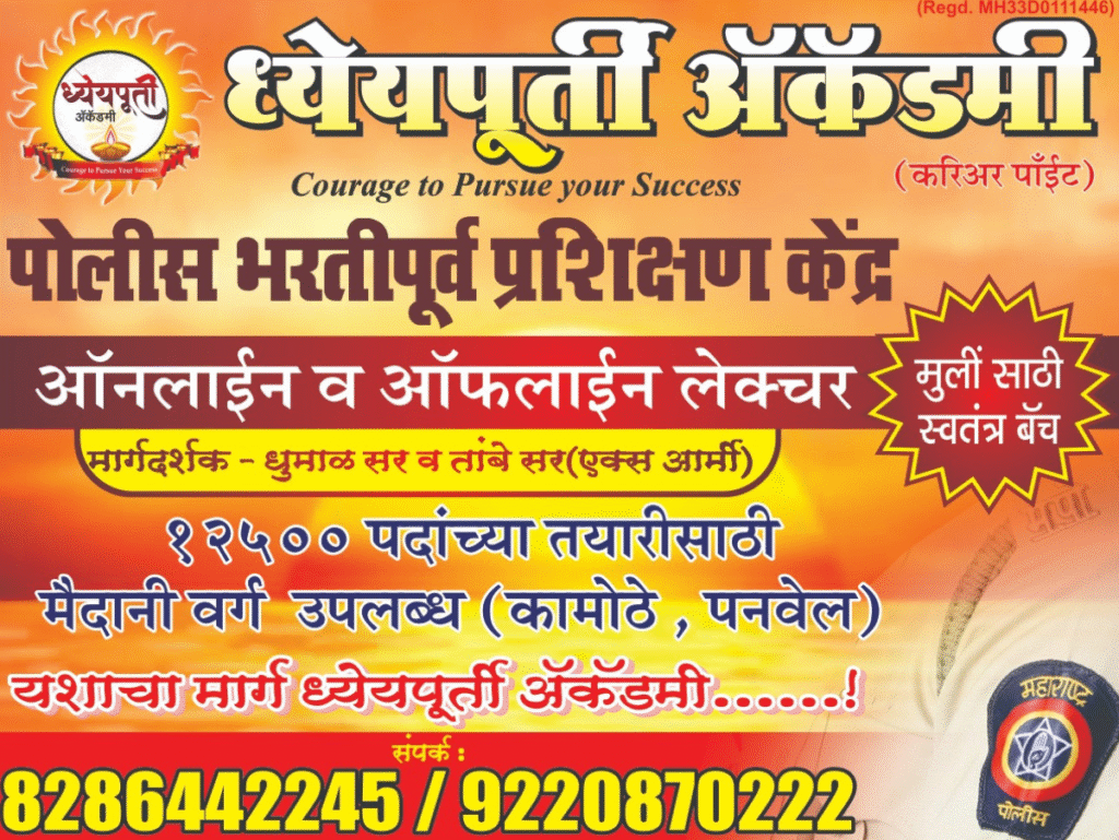 Prepare confidently for Municipal Corporation Recruitment Exams with Dheyapurti Academy, Thane – a trusted name in government job coaching in Maharashtra. Our structured programme is designed for posts like Clerk, Typist, Sanitation Inspector, Junior Engineer, and Peon under Nagar Palika, Nagar Parishad, and Mahanagarpalika Bharti. We cover the complete syllabus including Marathi Grammar, English Language, General Knowledge, Mathematics, Logical Reasoning, and Current Affairs with a special focus on Municipal Acts and local governance. Our training includes bilingual notes, daily practice tests, typing sessions (if required), and personalized mentorship. Whether you're targeting Municipal Corporation Clerk Bharti or Urban Development Department exams, we help you improve speed, accuracy, and confidence through expert guidance.